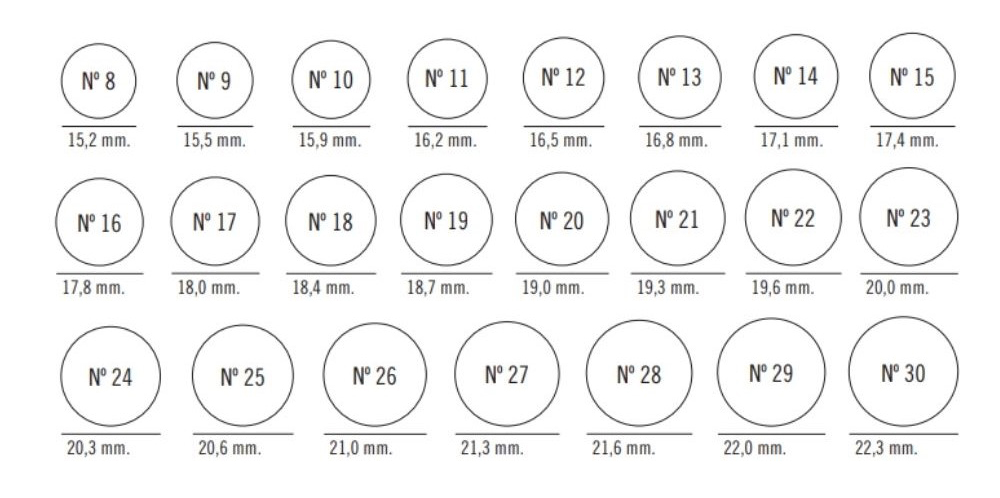 En nuestro país utilizamos un tallaje estándar que suele ir de la talla 8 a la 30, tanto para hombre como para mujer. Aquí tienes una tabla de referencia para que entiendas cómo funcionan las medidas según el diámetro interior: