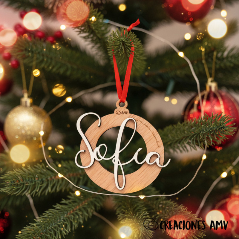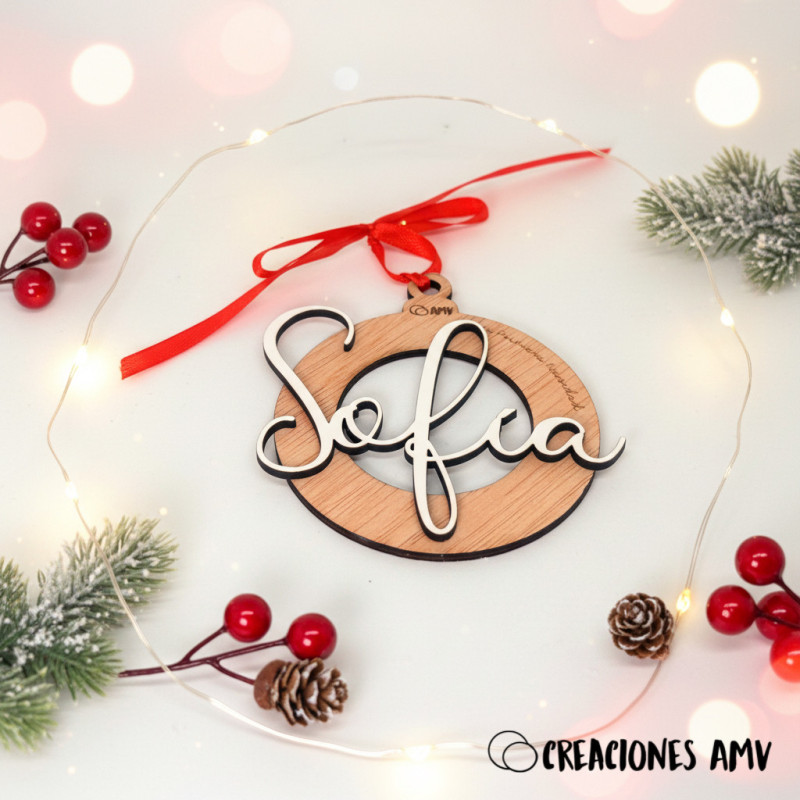 Fabricado en madera natural grabada y con el nombre en relieve, combina elegancia, calidez y personalización en una sola pieza. Su cinta roja le da el toque festivo perfecto para colgar en el árbol o usar como decoración en casa.