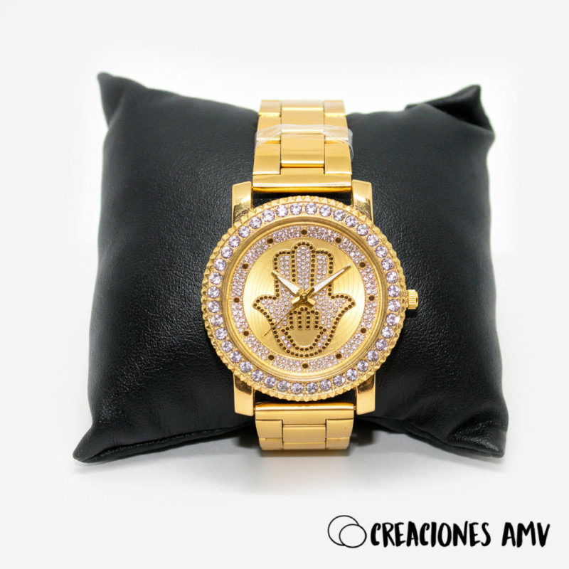 En el centro de su esfera destaca un delicado Hamsa, también conocido como Mano de Fátima, un símbolo universalmente relacionado con la protección, la buena fortuna y la energía positiva. Su presencia aporta equilibrio y un toque espiritual a un diseño moderno y estilizado.