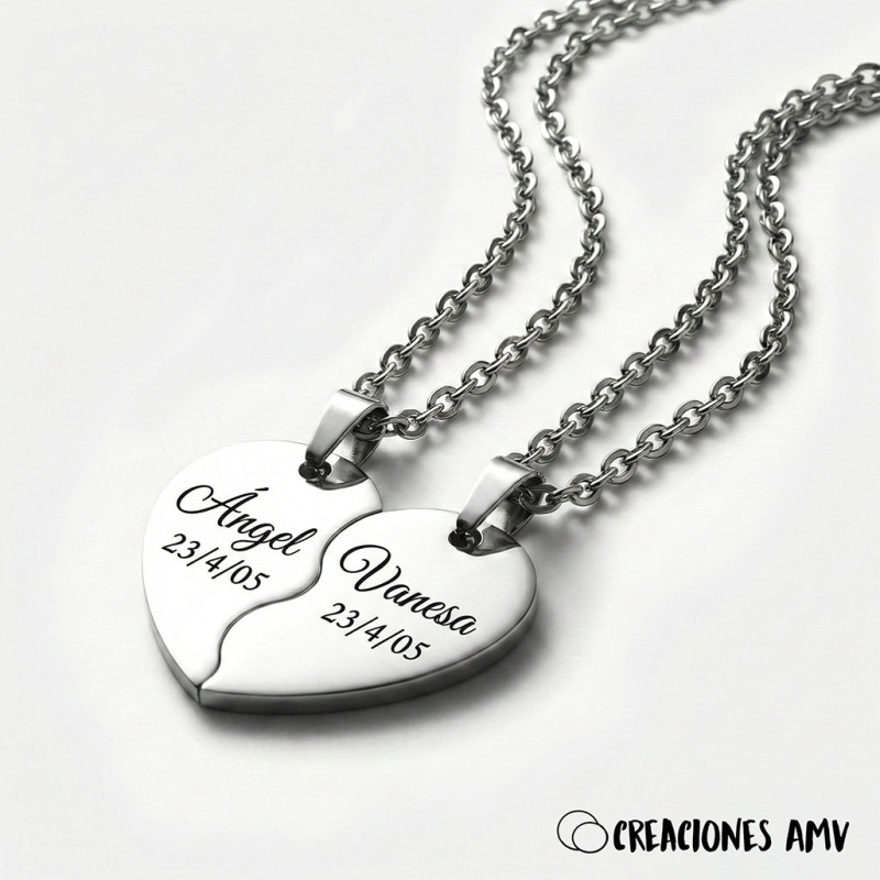Este conjunto es totalmente personalizable. Grabamos mediante tecnología láser el nombre y la fecha que nos indiques en cada una de las mitades del corazón. El grabado es nítido, elegante y totalmente resistente al roce y al paso del tiempo.