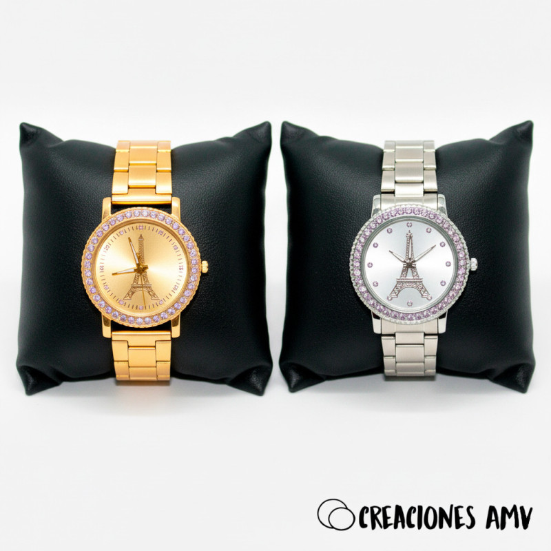 El Reloj Paris Charm combina elegancia y estilo europeo con su esfera decorada con la Torre Eiffel y detalles parisinos, disponible en acabados dorado y acero inoxidable.